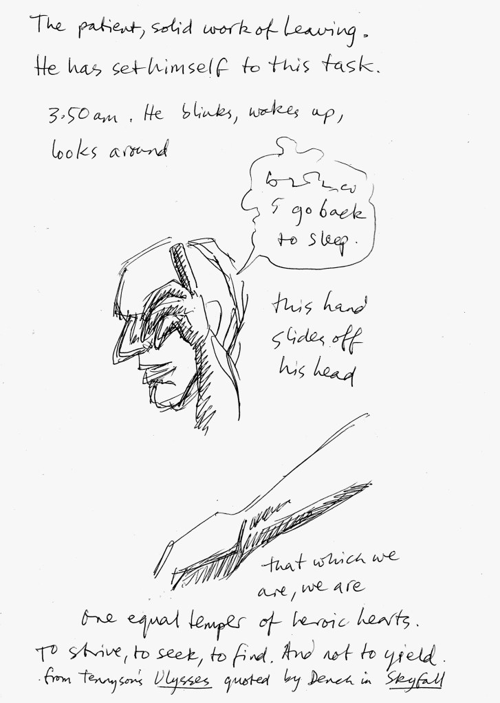 Each night you’d sit up with dad and watch a film, and then you and and the other person on duty would take turns on watch. On the night of Sunday 3 May, Justin and Salv and I watched the 2012 James Bond film Skyfall (terrible) and I took first watch.