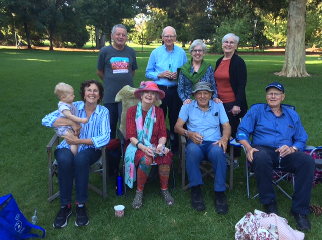 A photo from Chris Twining – thanks, Chris! – of Dad’s last leap year celebration in the Fitzroy Gardens with Rosemary, Lawry, MaryAnne, Joe, Julie, Salv, Chris and Tony.